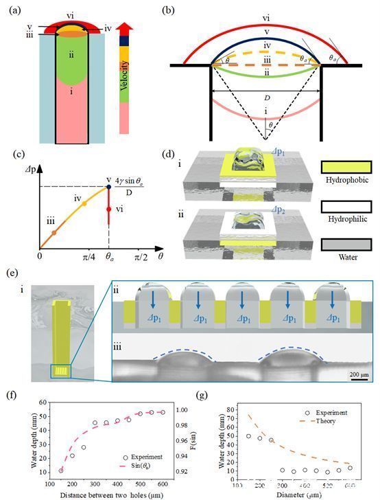 实验结果表明,由于毛细力的作用(图3a-ⅰ),水在孔的末端以较高的速度上升(图3a-ⅱ)。而由于惯性作用,水将会在达到出口之后继续上升(图3a-ⅲ),同时,拉普拉斯压力随着孔口液滴弯月面曲率减小而逐渐增大。当拉普拉斯压力达到最大时,如果水的动能使动态接触角大于表面前进接触角,水将会从孔中溢出(图3a-c)。因此,鉴于内表面具备疏水性,水不能渗透到多孔仿生微结构内 (图3d-ⅰ)。相反,由于另外一侧是超亲水表面,最大拉普拉斯力接近0,水将从多孔仿微结构疏水侧渗透到亲水侧(图3d-ⅱ),从而使得该仿生结构具有优异的单向液体穿透能力。