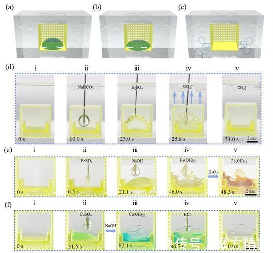 图4. 水下仿生细胞内部的化学反应。(a)水下仿生细胞。(b)液滴滴在仿生细胞内表面时,仿生细胞的排水特性。(c)液滴滴在仿生细胞外表面时的拒水性能。(d)0.5mol?L-1NaHCO3与0.5mol?L-1H2SO4在仿生细胞内的化学反应。(e)0.5mol?L-1FeSO4与0.5mol?L-1NaOH在充满CO2的仿生细胞内的化学反应。(f)我们的仿生细胞在水下的自清洁性能。