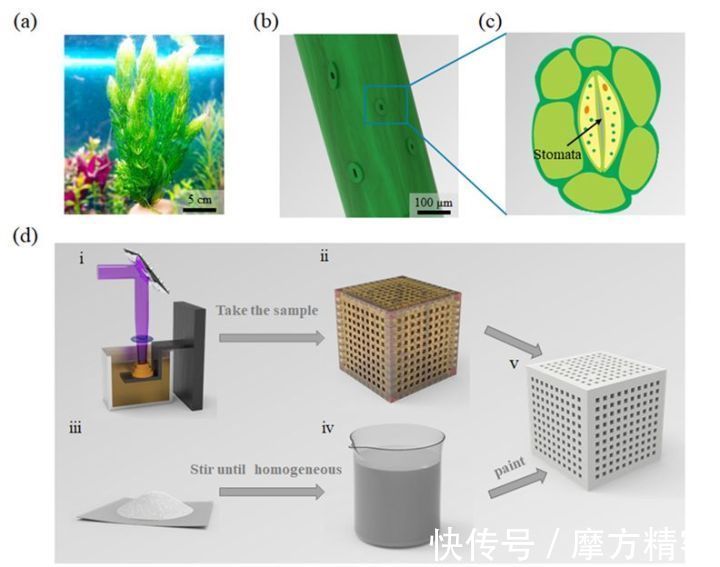 图1. 一种仿生功能开放细胞。(a)金鱼藻。(b)金鱼藻表面覆盖着独特的气孔。(c)金鱼藻表面单气孔示意图。(d)利用PμSL 3D打印技术制备仿生开孔细胞。